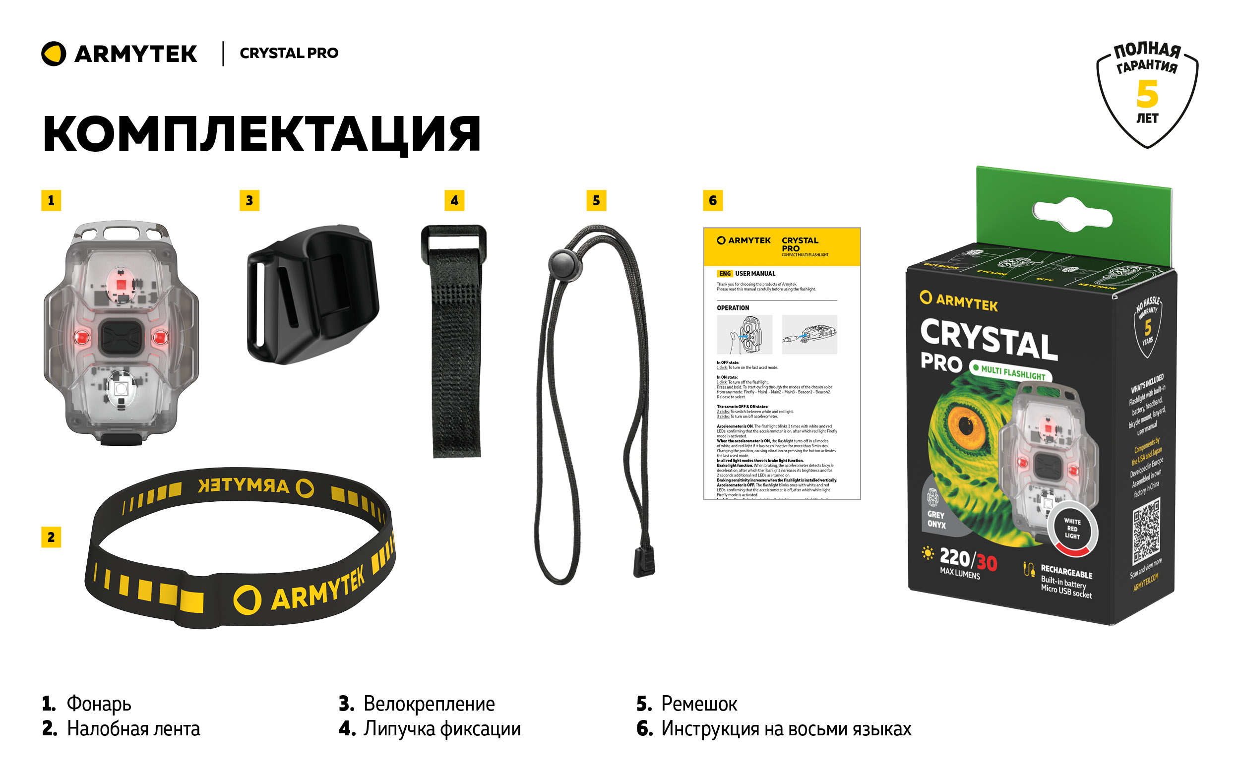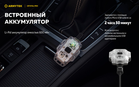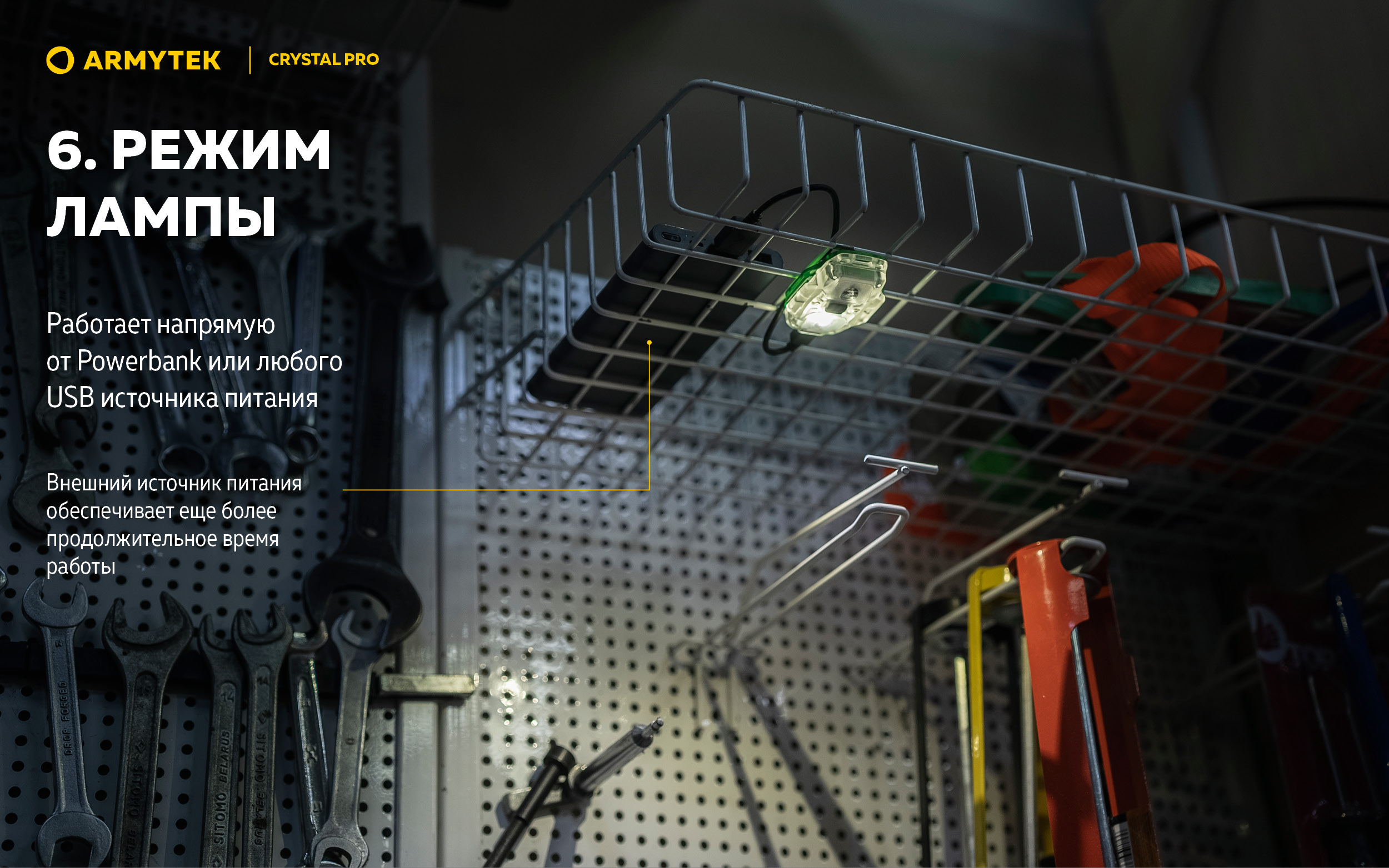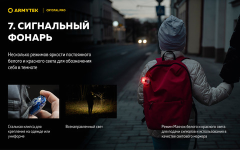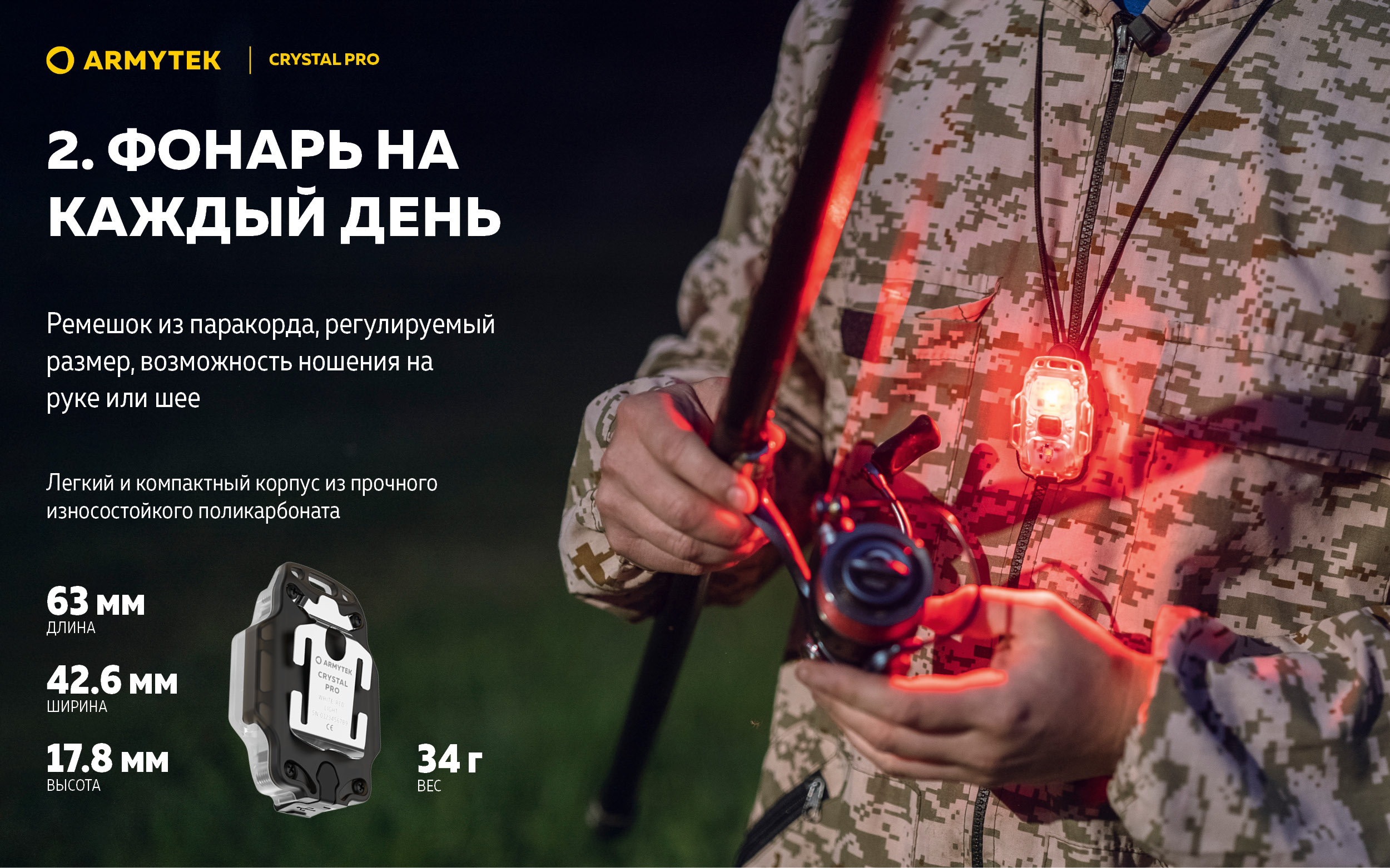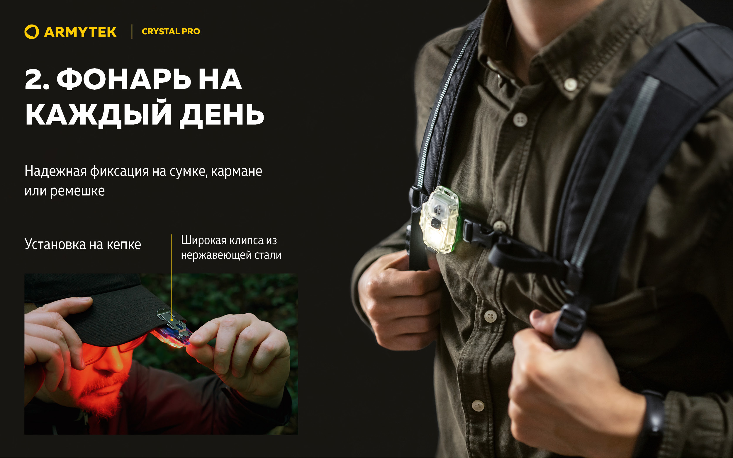 Благодаря компактным габаритам фонарь удобно носить с собой в кармане или сумке на случай, если понадобится дополнительный источник освещения. Crystal Pro оснащен стальной клипсой для крепления на одежде, ремне или шлейке рюкзака. В комплект входит налобная лента для фиксации фонаря на голове во время вечерней пробежки или выполнения работ, а также ремешок на руку или шею. С помощью прочного ремешка Crystal Pro можно подвесить на ветку дерева или на крючок под потолком палатки для освещения лагеря в случае поездки на природу.