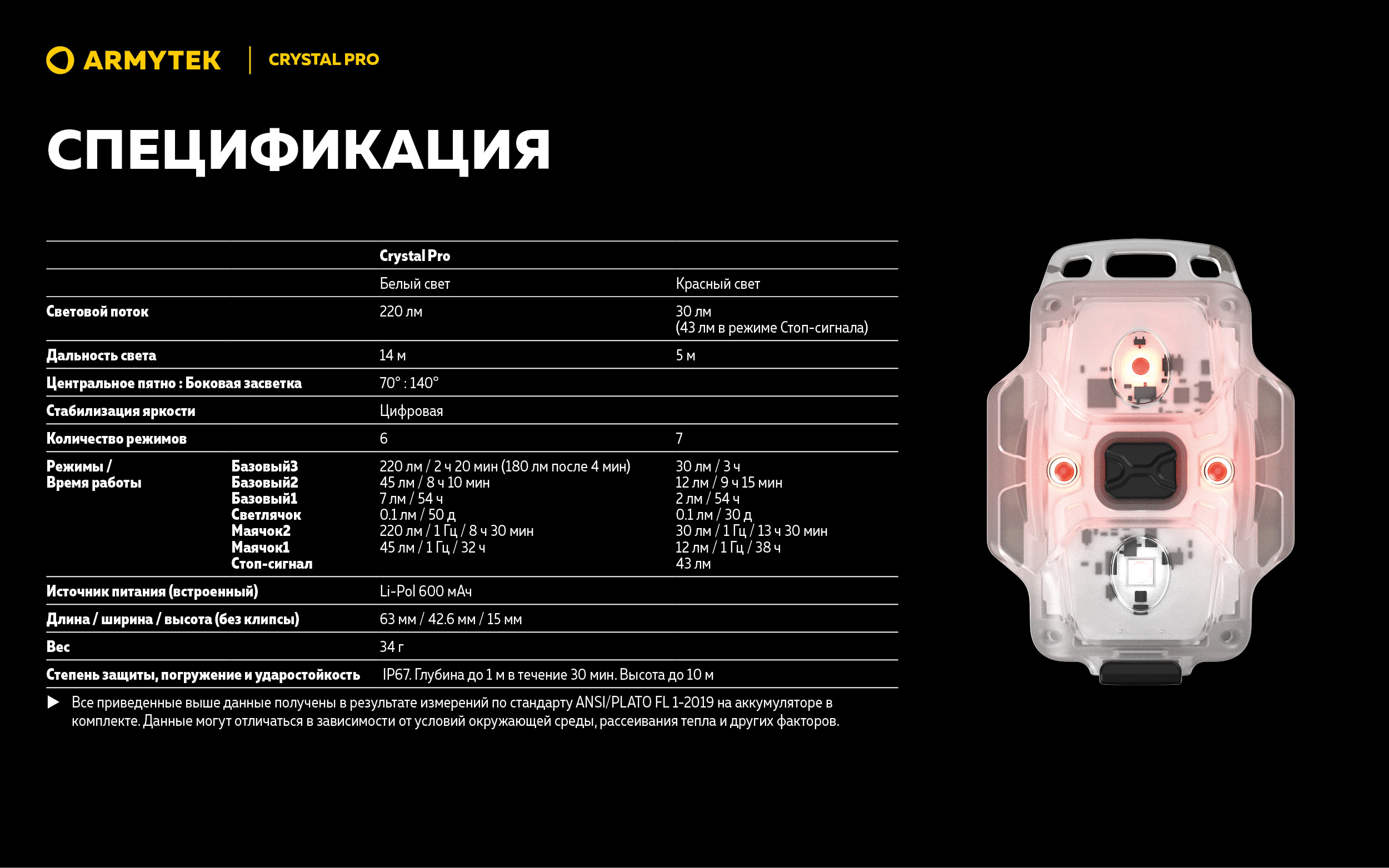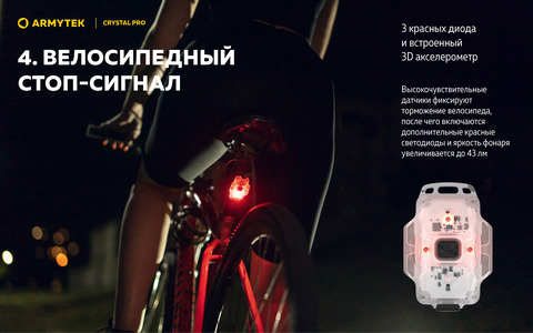 Велосипедный стоп-сигнал — это новая функция компактного мультифонаря Armytek, существенно расширяющая сферы применения. Специально для использования в качестве стоп-сигнала Crystal Pro оборудован встроенным 3D акселерометром. Высокочувствительные датчики фиксируют торможение велосипеда, после чего включаются дополнительные красные светодиоды и яркость фонаря увеличивается до 43 люмен. Надежно зафиксировать фонарь на велосипеде поможет комплектное велокрепление.