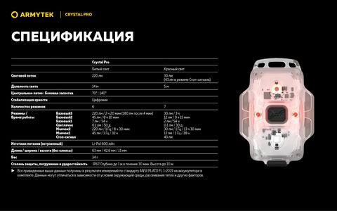 В дополнение к светодиоду белого света Crystal Pro оснащен тремя диодами красного света. Основной диод красного света обеспечивает максимальный световой поток в 30 люмен. Два боковых диода красного света работают в режиме велосипедного стоп-сигнала.