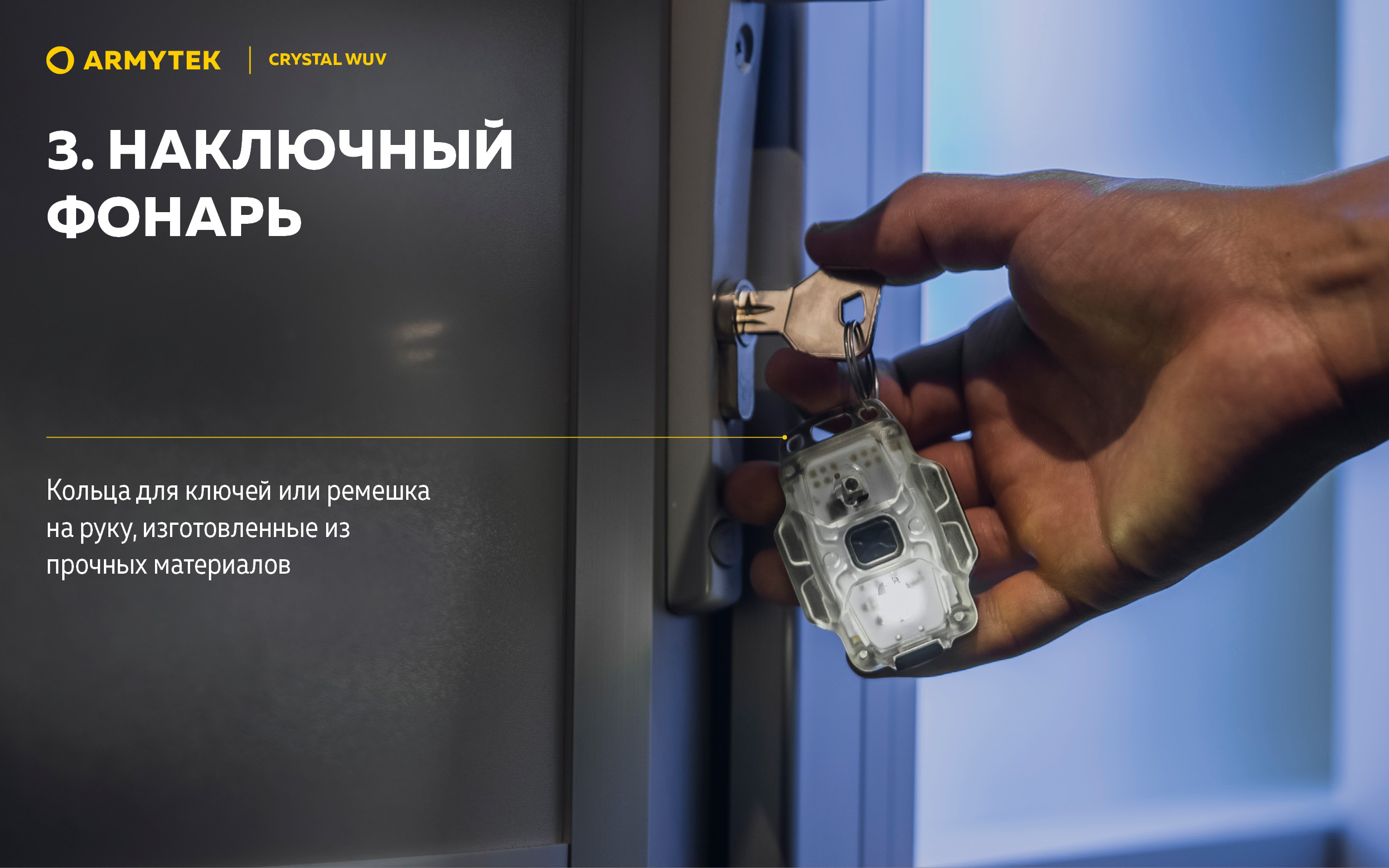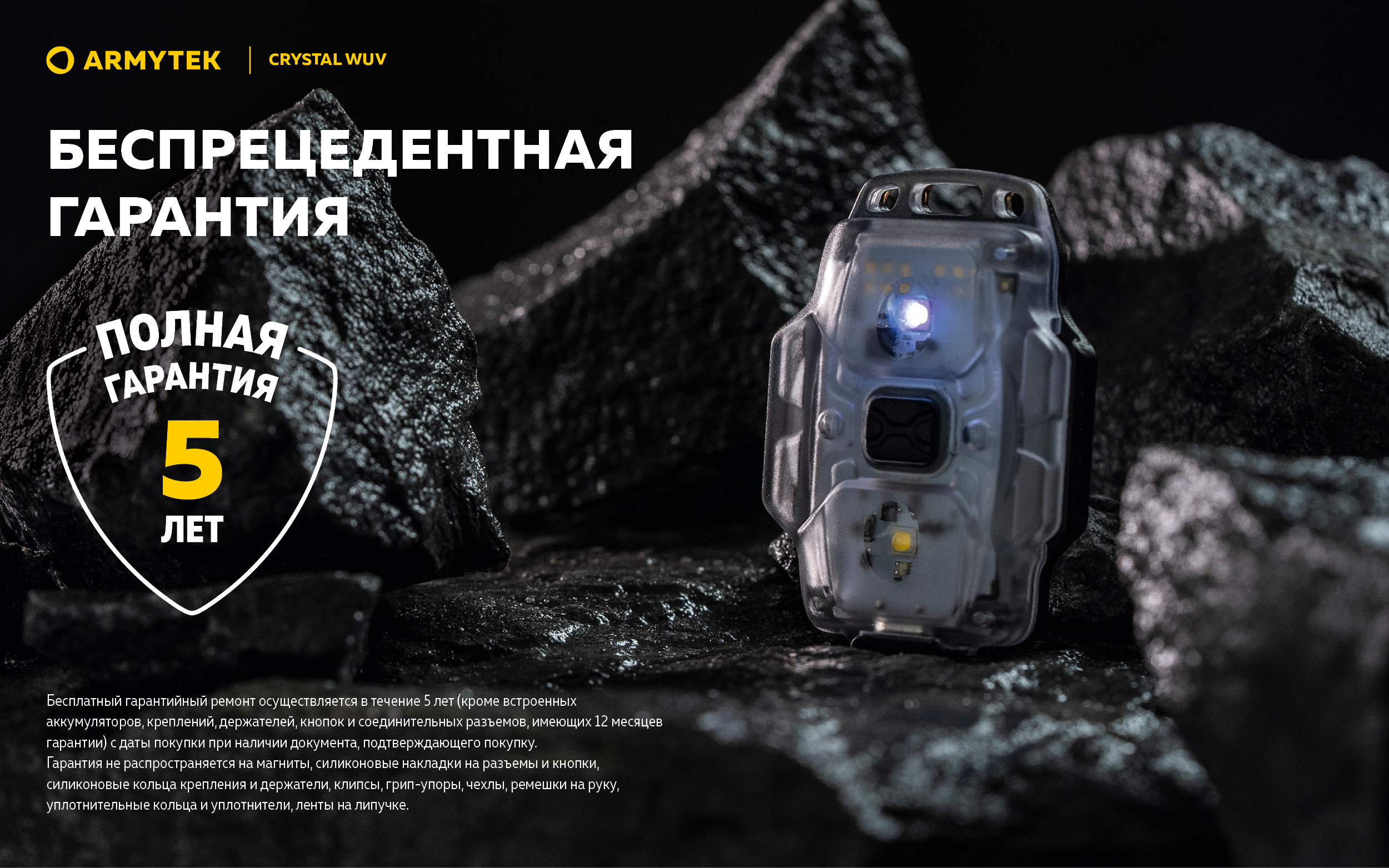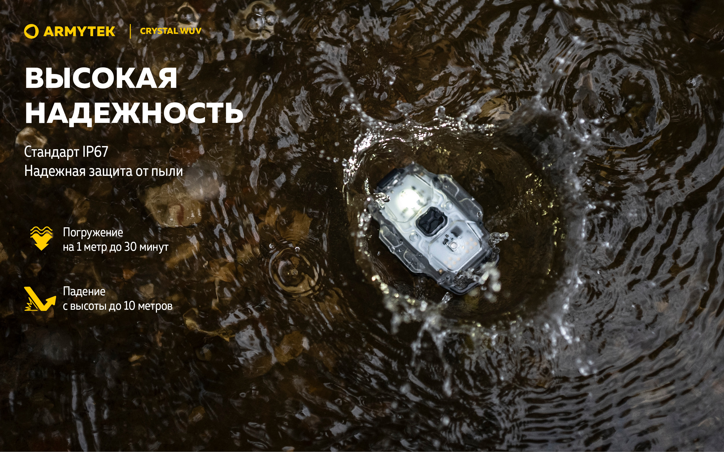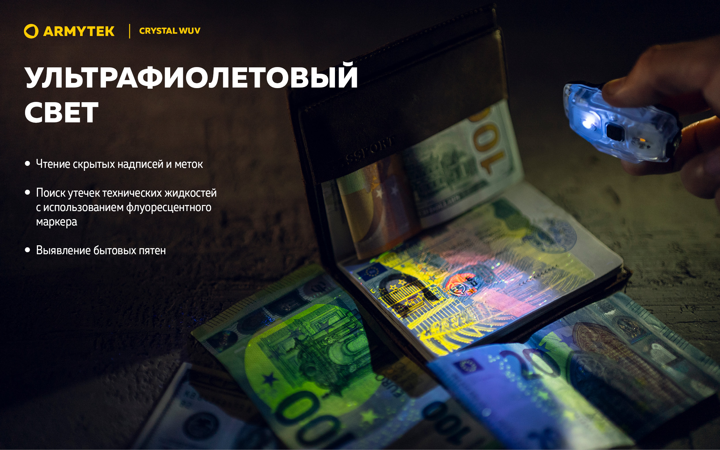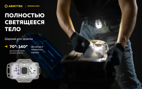 Crystal WUV — это универсальная модель серии Crystal c белым и ультрафиолетовым светом. Как и другие компактные мультифонари Armytek, Crystal WUV обеспечивает широкий заливающий свет для использования на близком расстоянии во время вечерней прогулки, пробежки или выполнения задач в условиях недостаточной освещенности.