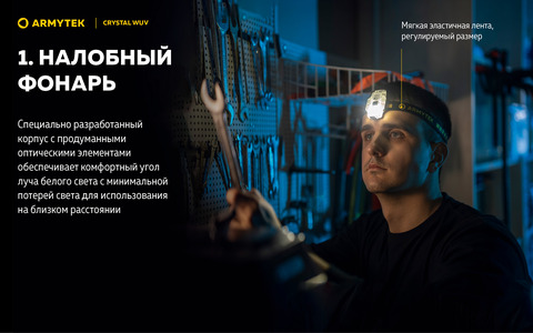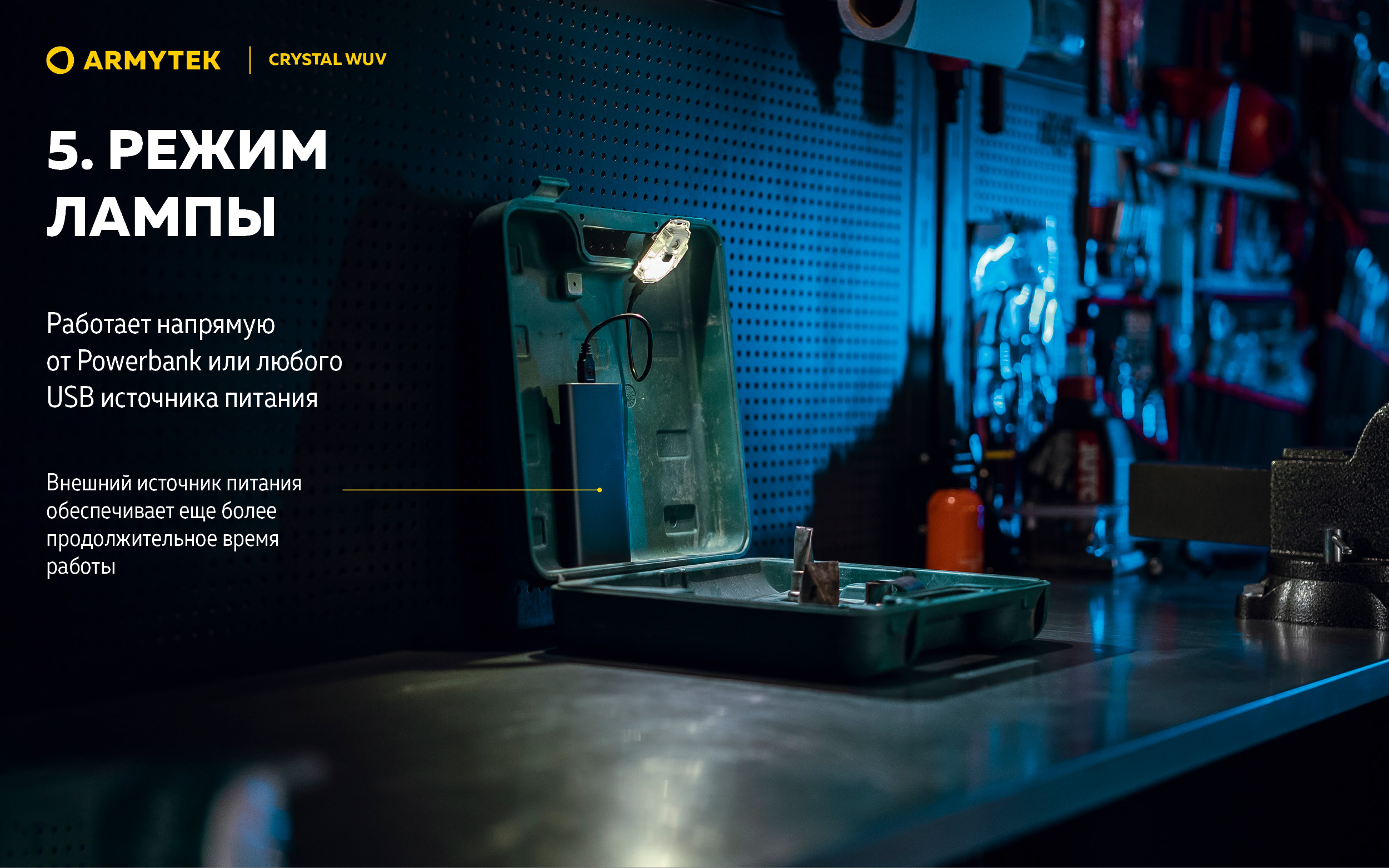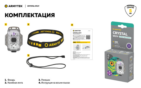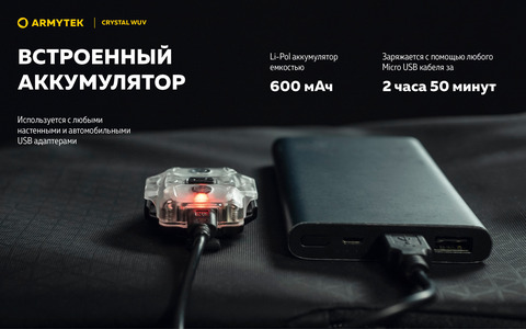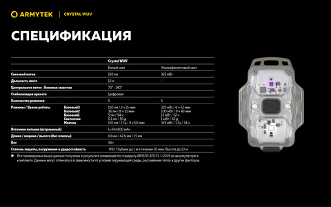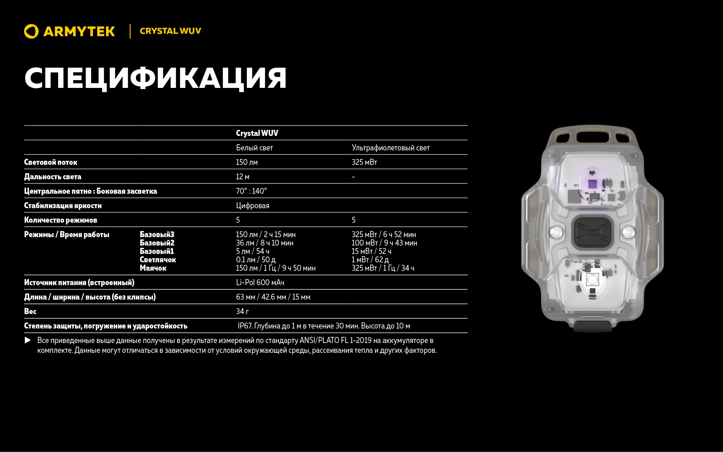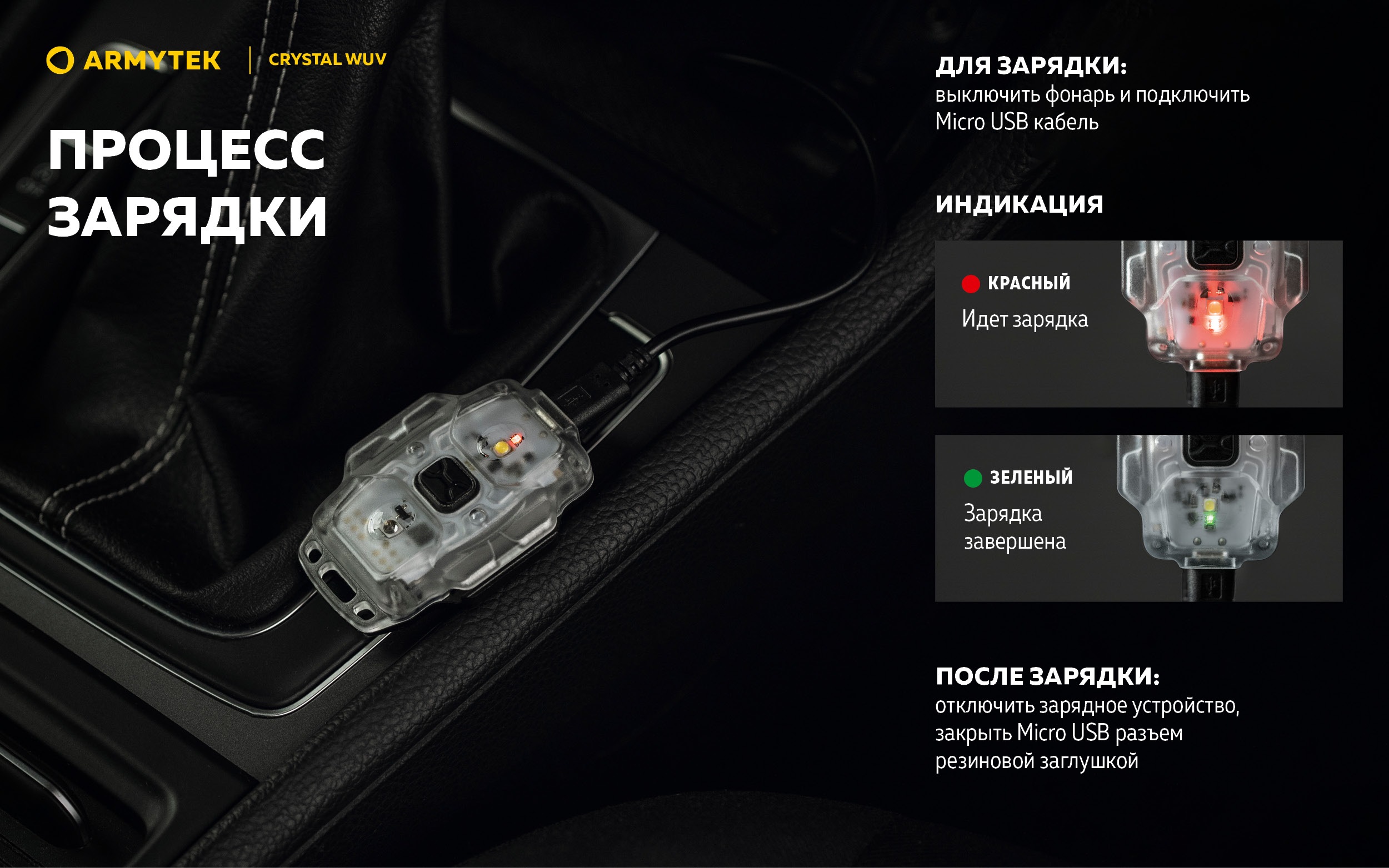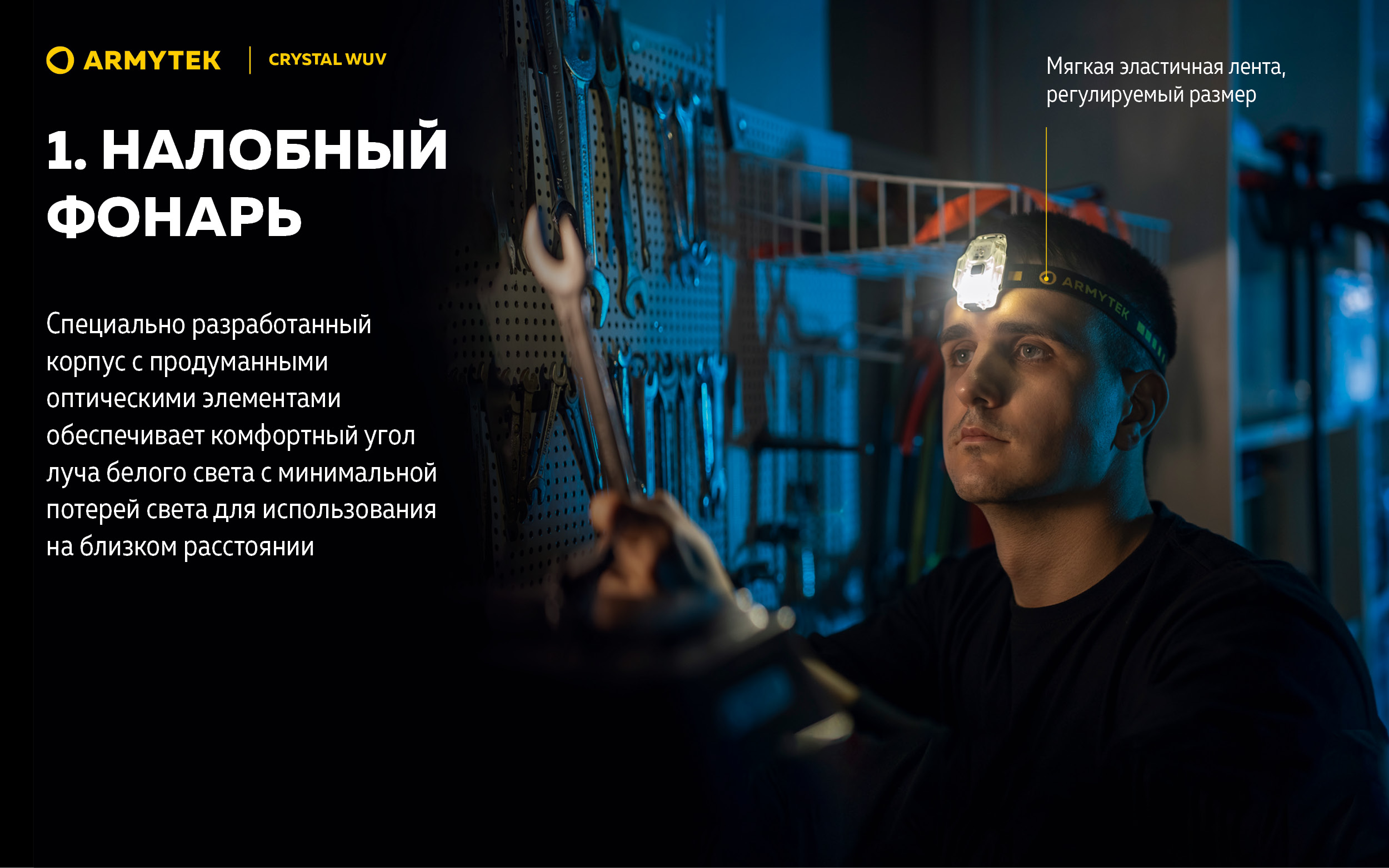 Crystal WUV — это универсальная модель серии Crystal c белым и ультрафиолетовым светом. Как и другие компактные мультифонари Armytek, Crystal WUV обеспечивает широкий заливающий свет для использования на близком расстоянии во время вечерней прогулки, пробежки или выполнения задач в условиях недостаточной освещенности.