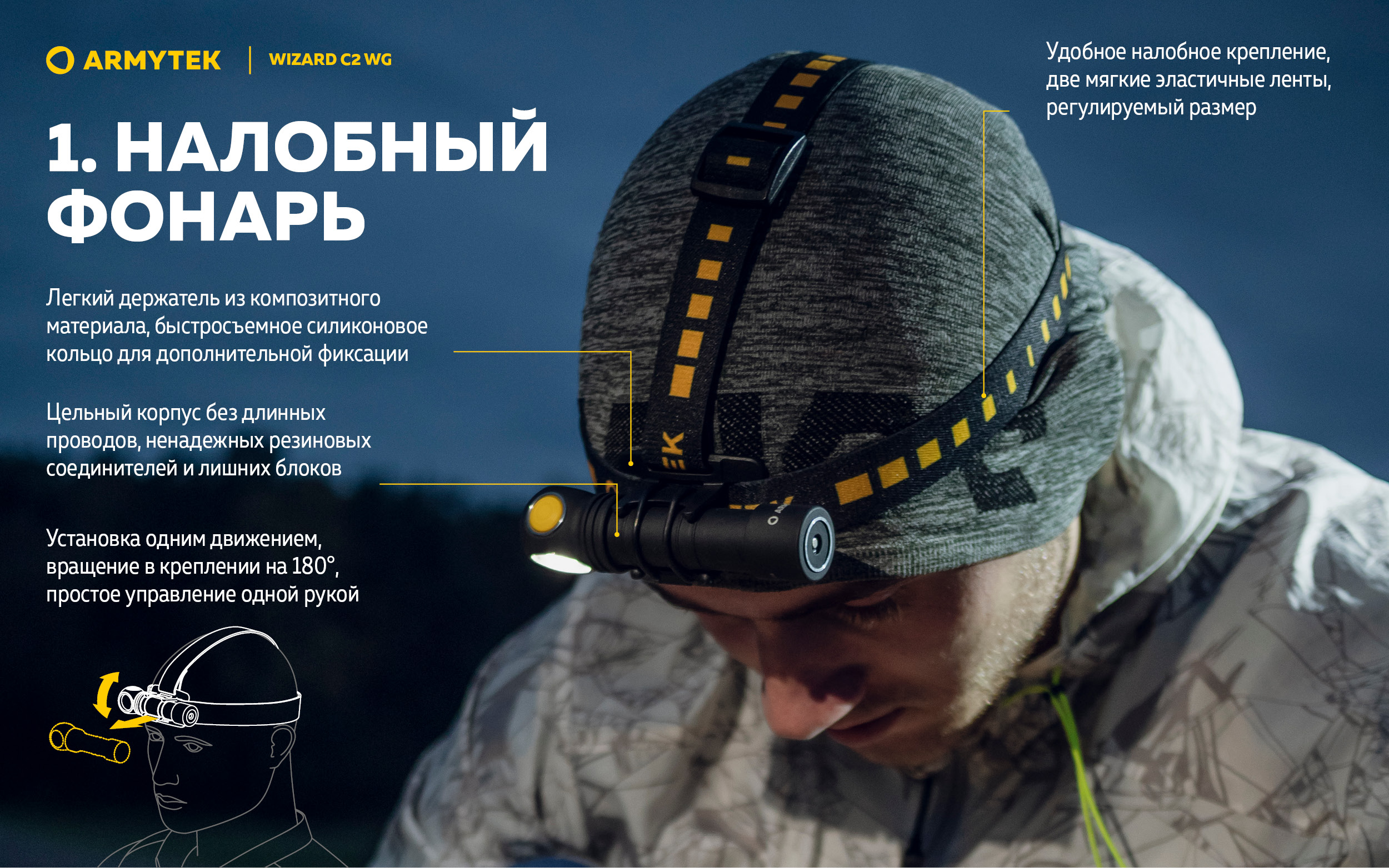 Удобное налобное крепление с двумя мягкими эластичными лентами, легким держателем из композитного материала и силиконовым кольцом для дополнительной фиксации. Ленты надежно фиксируют фонарь, не натирают кожу и не оставляют следов. Фонарь устанавливается одним движением, размер налобного крепления регулируется.