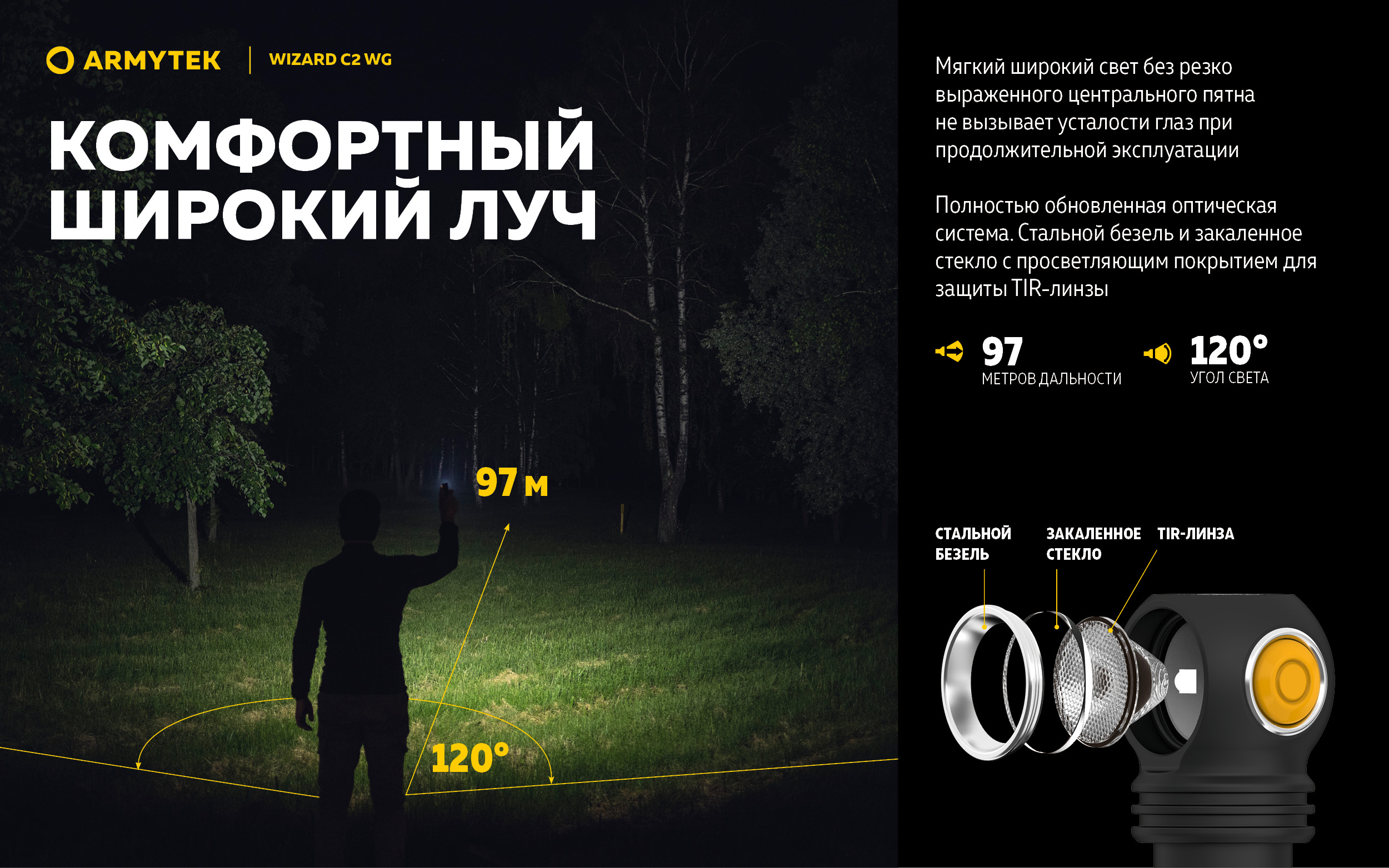 Новая оптическая система и TIR-линза: пропускает больше люмен, обеспечивает большую дальность луча с комфортной широкой засветкой.