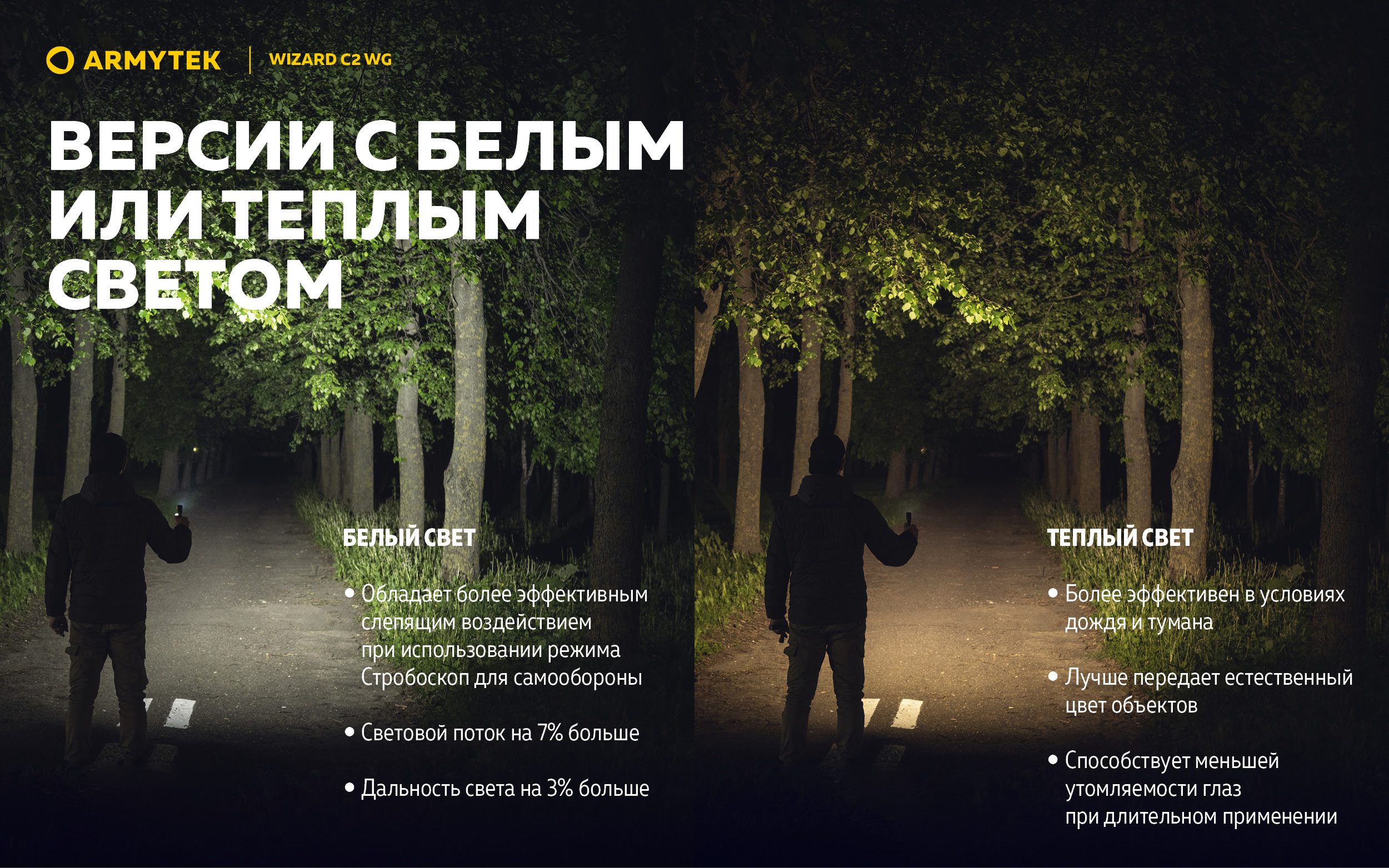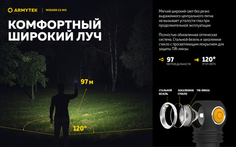 Как и красный, зеленый световой поток эффективен во время тумана и в других условиях затрудненной видимости, комфортен для продолжительного использования. Однако зеленый свет обладает важным преимуществом: обеспечивает большую четкость линий и детализацию объектов, позволяет различать цвета. Он практически незаметен со стороны, а также не воспринимается как угроза животными и птицами, что особенно полезно на охоте или для наблюдения за дикой природой. Использование Wizard C2 WG в режимах зеленого света не привлекает назойливых насекомых.