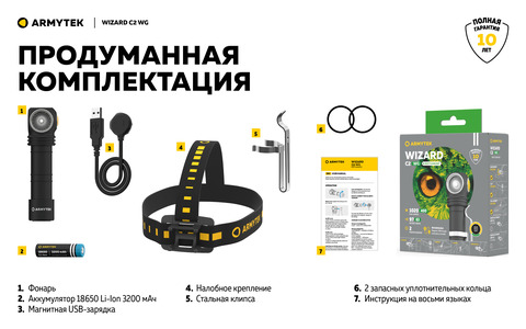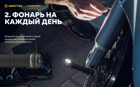 Модель имеет несколько вариантов установки. Мощный магнит в задней крышке позволяет прикрепить фонарик к любой металлической поверхности. В комплект входит удобное налобное крепление и стальная клипса для фиксации на одежде или рюкзаке. Wizard C2 WG также совместим с опциональным велокреплением ABM-01, а также с креплением на каску AHM-02.