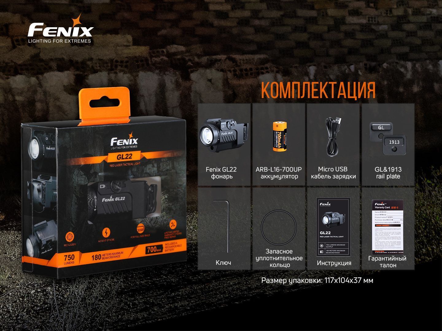 Фонарь модели Fenix GL22, аккумулятор ARB-L16-700UP литий-ионный, кабель зарядки micro-USB, планка Пикатинни, шестигранник, запасное уплотнительное кольцо, руководство пользователя, гарантия.