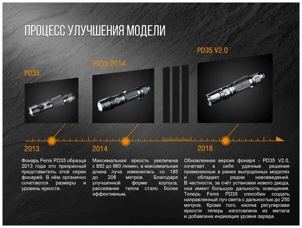 Компактный и надежный фонарь Fenix PD35 V2.0 станет хорошим выбором для тех, кому необходим яркий источник света, который можно всюду носить с собой. За счёт установки современных комплектующих он способен создавать действительно яркий луч света, позволяющий рассеять кромешную тьму. Интуитивно понятное управление даст возможность с комфортом использовать фонарь практически в любой ситуации. А прочный металлический корпус, который к тому же полностью водонепроницаем, защищает «начинку» фонаря от различных внешних воздействий.