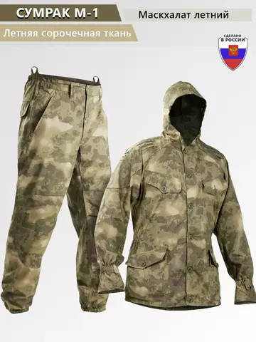 Мешковатый покрой костюма «смазывает» силуэт человеческой фигуры, «в нем не так жарко» - обеспечивает лучшую вентиляцию пододёжного пространства, не сковывает свободы движения во всех плоскостях, наличие таких элементов как капюшон, стяжки по низу брюк и рукавов обеспечивают костюму лучшие защитные свойства от гнуса, присутствуют крепления для дополнительной естественной маскировки (травы, веток и др.). В результате, произошло как-бы сращивание классического маскхалата (типа комбинезона маскировочного модернизированного образца 1957 года, так называемого КЛМК), одеваемого поверх и полевого костюма повседневной носки в единое изделие со свойствами маскхалата и полевого костюма. К указанному виду боевого обмундирования можно отнести представленный Костюм маскировочный летний «Сумрак – М1» (Сумрак - модификация 1)