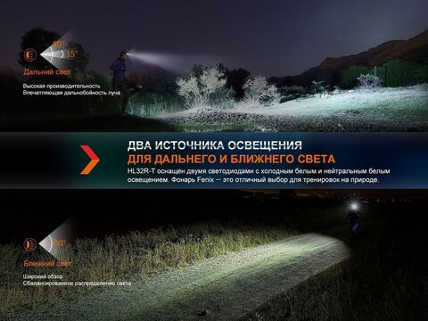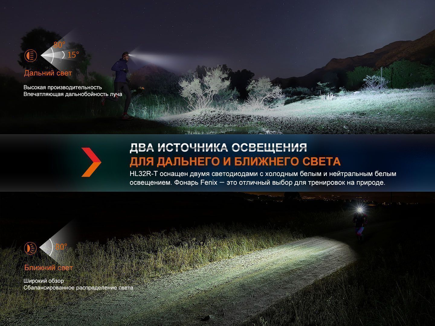 Интерфейс Fenix HL32R-T представлен двумя группами режимов. Ближний свет с цветовой температурой света 4000К имеет угол освещения 80°, а дальний свет с цветовой температурой 6500К генерирует сконцентрированный световой луч 15° с мягкой засветкой 80°. Группа ближнего света также включает мигающий режим SOS.