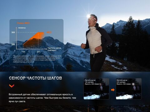 В максимальном режиме дальнобойной группы мощность светового потока достигает 800 люмен. Дальность света в этом режиме равна 132 метрам. Но главная функциональная особенность фонаря — наличие датчика движения, который считывает частоту шага пользователя и самостоятельно меняет яркость освещения без необходимости осуществлять это вручную. Датчик активен во всех режимах кроме мигающего, увеличивая мощность света при ускорении шага и снижая ее при замедлении. Например, если пользователь движется со скоростью порядка 150 шагов / минуту, то яркость будет составлять 200 люмен, а при 220 шагах / минуту данное значение автоматически повысится до 300 люмен.