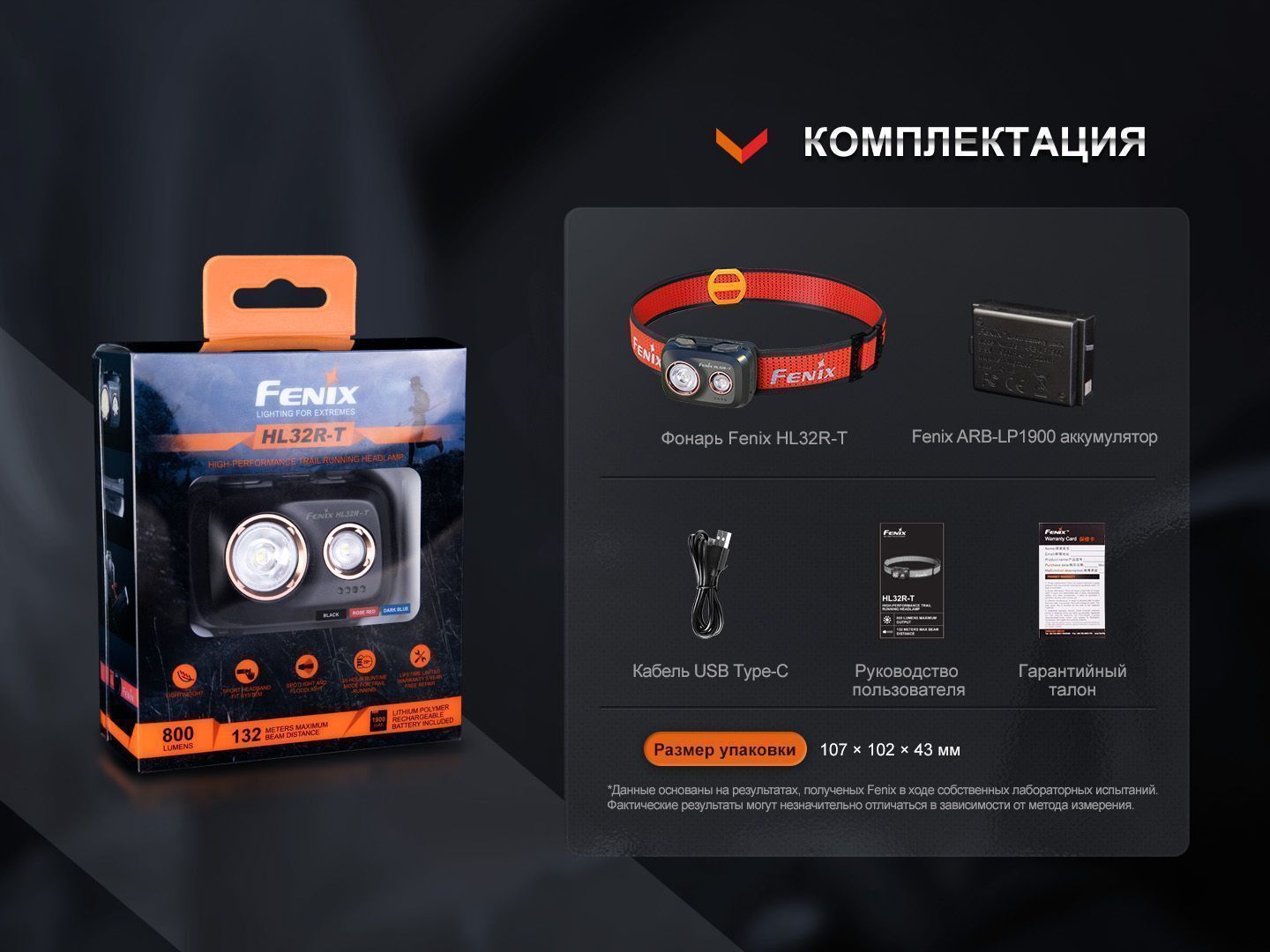 Фонарь Fenix HL32R-T, Li-ion аккумуляторный блок ARB-LP1900, зарядный кабель USB Type-C, инструкция по эксплуатации, гарантия.