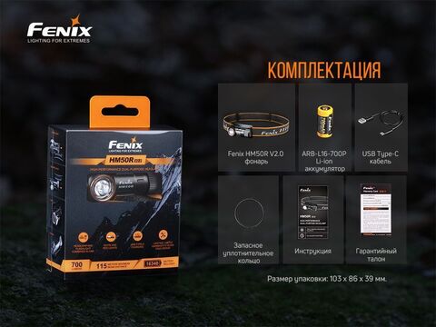 Фонарь модели Fenix HM50R V2.0, литий-ионный аккумулятор ARB-L16-700P, кабель для зарядки USB Type-C, запасное уплотнительное кольцо, руководство пользователя, талон гарантии.