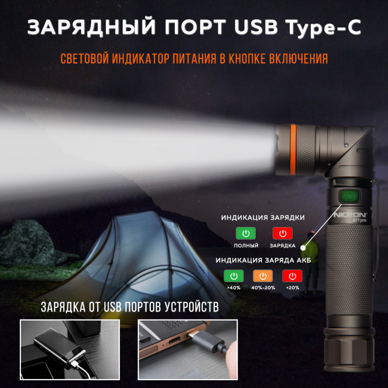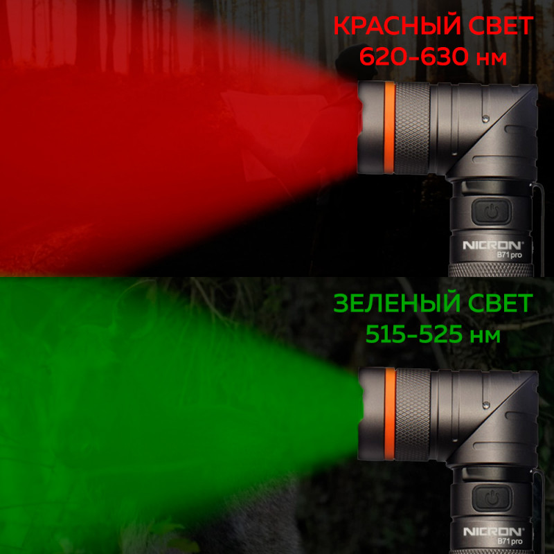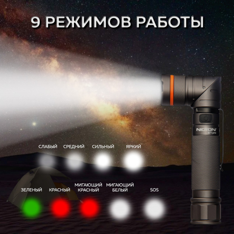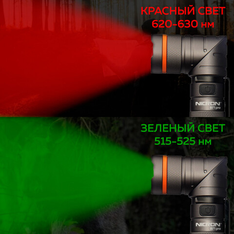 NICRON B71PRO - перезаряжаемый светодиодный профессиональный поворотный фонарь яркостью 1800 lm с дальностью луча 189 метров, с дополнительным красным и зеленым светом.
