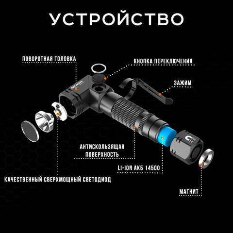 Уникальная поворотная головка с магнитным хвостовиком позволяет легко регулировать угол освещения.