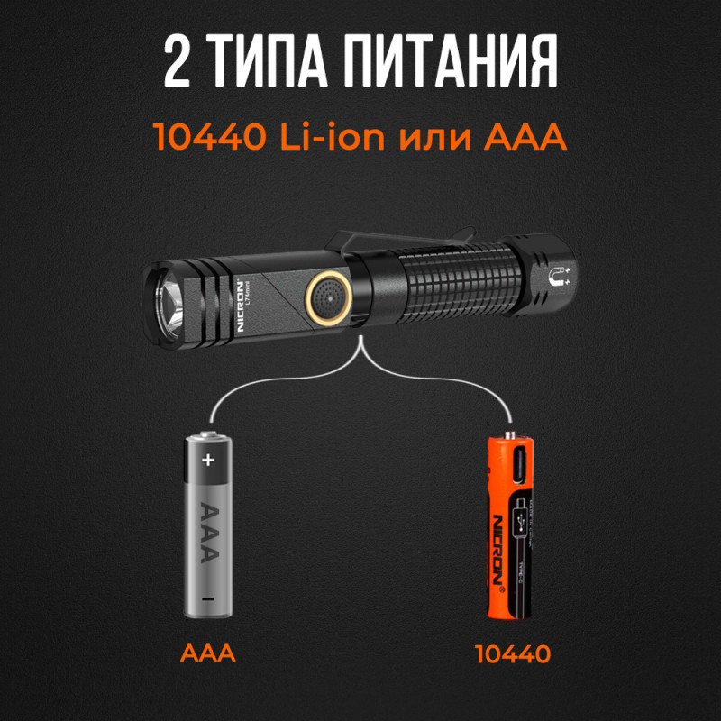 Данная модель фонаря имеет 2 типа питания: литий-ионный аккумулятор типа 10440 (емкостью 180 мАч ) с зарядным портом и системой защиты от короткого замыкания или 1 элемент питания типа AАA.