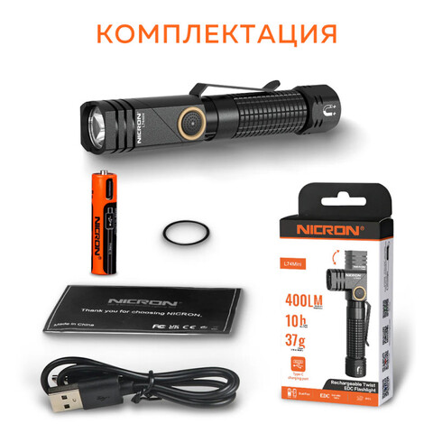В комплекте: фонарь, литий-ионный аккумулятор типа 10440 (емкостью 180 мАч) с системой защиты от короткого замыкания, клипса-зажим, USB-кабель Type-C, клипса-зажим.