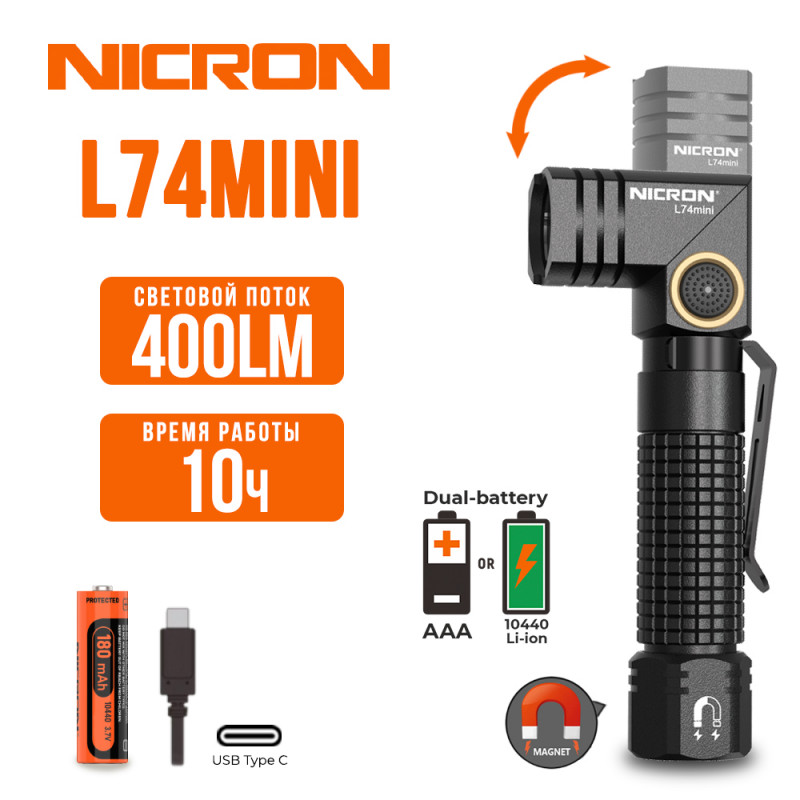 NICRON L74mini - перезаряжаемый EDC светодиодный поворотный фонарь яркостью 400 lm с дальностью луча 84 метра.